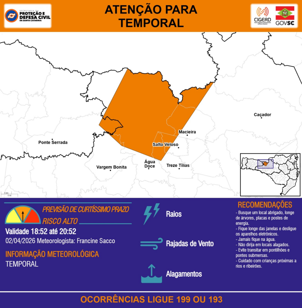 ATENÇÃO – 02/04 18:52 – TEMPORAL com RAIOS, RAJADAS DE VENTO e ALAGAMENTOS para as regiões do Oeste e Meio-Oeste nas próximas 2 horas. Ocorrências ligue 199 ou 193.