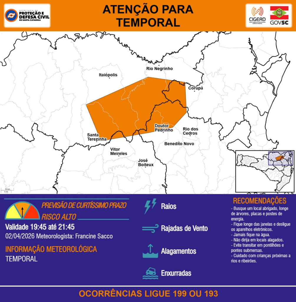 ATENÇÃO – 02/04 19:45 – TEMPORAL com RAIOS, RAJADAS DE VENTO, ALAGAMENTOS e risco de ENXURRADAS para as regiões do Planalto Norte, Litoral Norte, Médio e Alto Vale do Itajaí nas próximas 2 horas. Ocorrências ligue 199 ou 193.