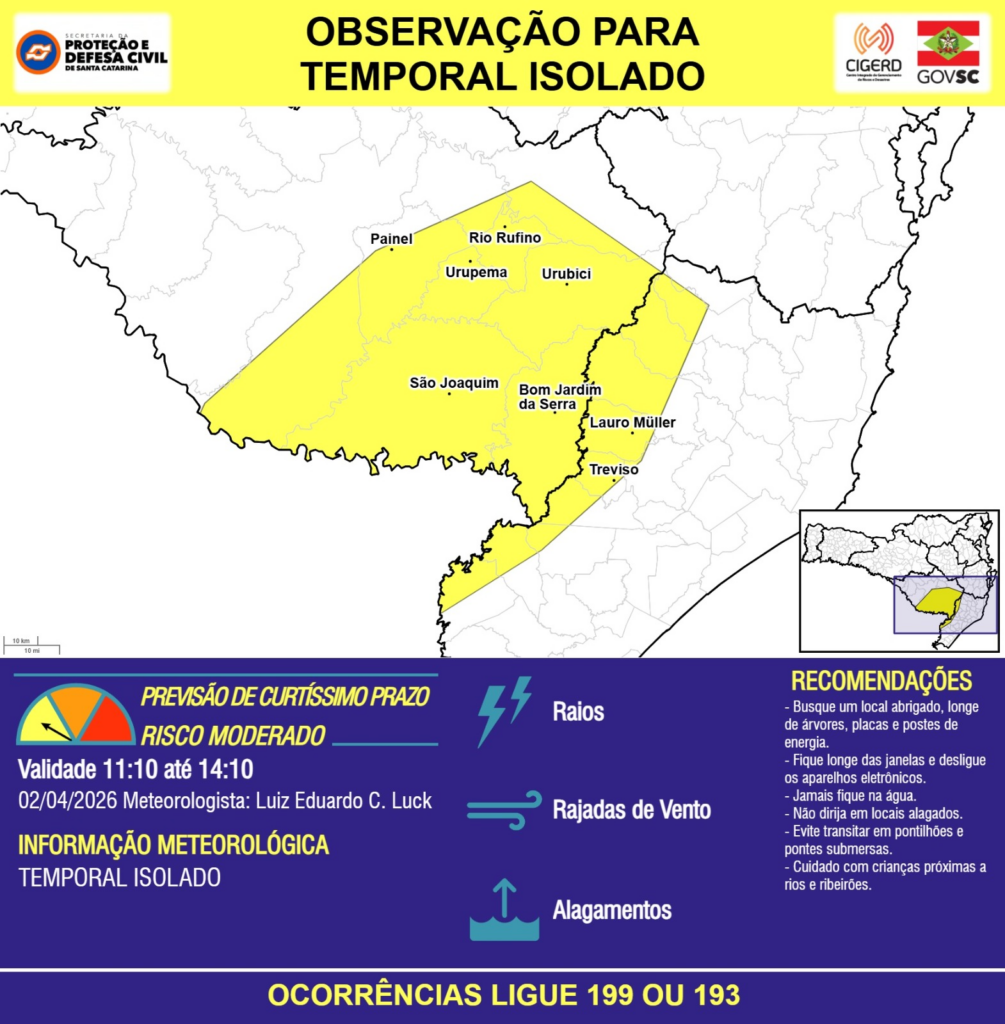 OBSERVAÇÃO – 02/04 11:10 – TEMPORAL ISOLADO com RAIOS, RAJADAS DE VENTO e ALAGAMENTOS pontuais para os municípios de Bom Jardim da Serra, Lauro Müller, Painel, Rio Rufino, São Joaquim, Treviso, Urubici e Urupema nas próximas 3 horas. Ocorrências ligue 199 ou 193.