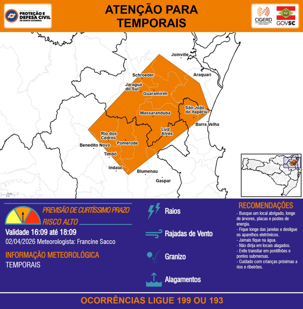 ATENÇÃO – 02/04 16:09 – TEMPORAIS com RAIOS, RAJADAS DE VENTO, GRANIZO e ALAGAMENTOS para as regiões do Litoral Norte, Baixo e Médio Vale do Itajaí nas próximas 2 horas. Ocorrências ligue 199 ou 193.