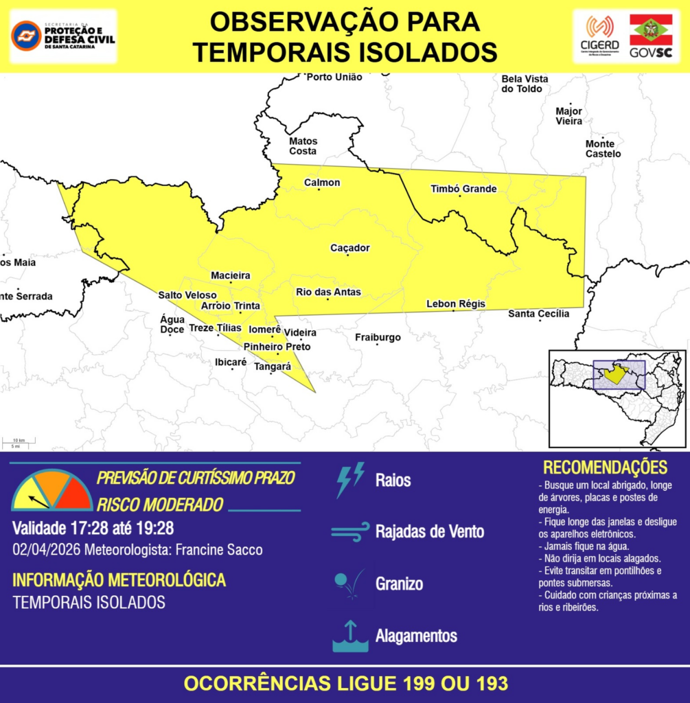 OBSERVAÇÃO – 02/04 17:28 – TEMPORAIS ISOLADOS com RAIOS, RAJADAS DE VENTO, GRANIZO e ALAGAMENTOS pontuais para os municípios de Arroio Trinta, Bela Vista do Toldo, Calmon, Canoinhas, Caçador, Fraiburgo, Ibicaré, Iomerê, Lebon Régis, Macieira, Major Vieira, Matos Costa, Monte Castelo, Passos Maia, Pinheiro Preto, Ponte Serrada, Porto União, Rio das Antas, Salto Veloso, Santa Cecília, Tangará, Timbó Grande, Treze Tílias, Videira e Água Doce nas próximas 2 horas. Ocorrências ligue 199 ou 193.