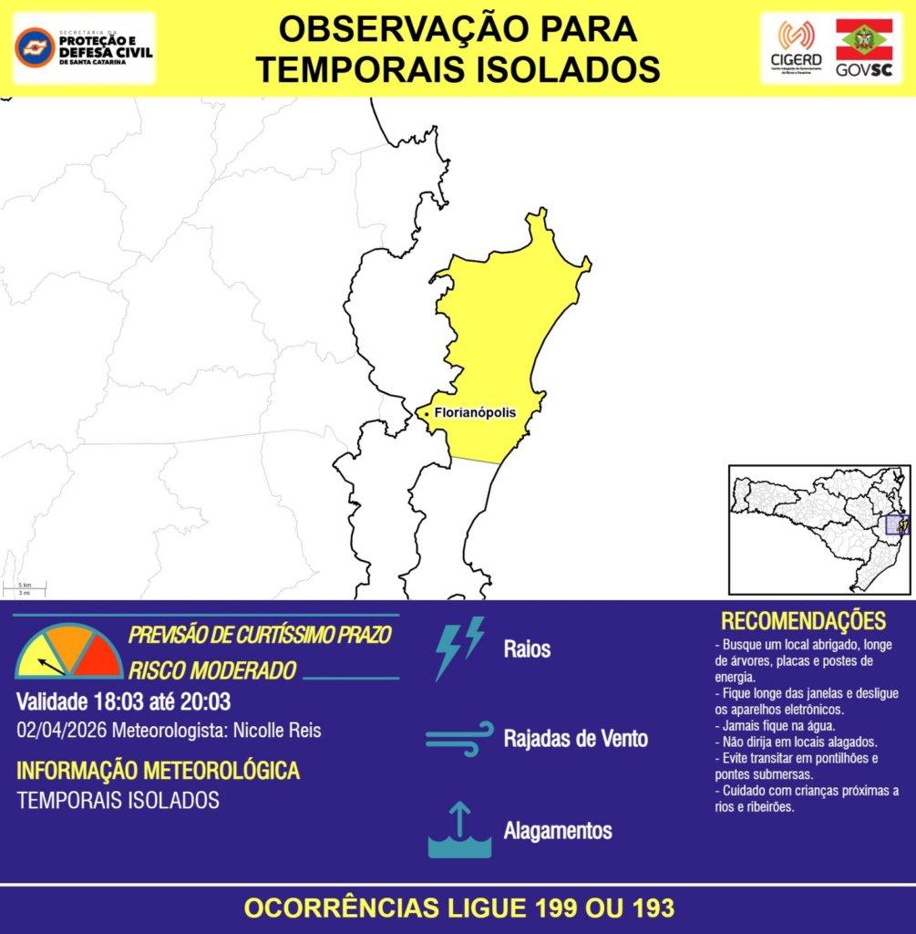 OBSERVAÇÃO – 02/04 18:03 – TEMPORAIS ISOLADOS com RAIOS, RAJADAS DE VENTO e ALAGAMENTOS pontuais para os municípios de Florianópolis nas próximas 2 horas. Ocorrências ligue 199 ou 193.