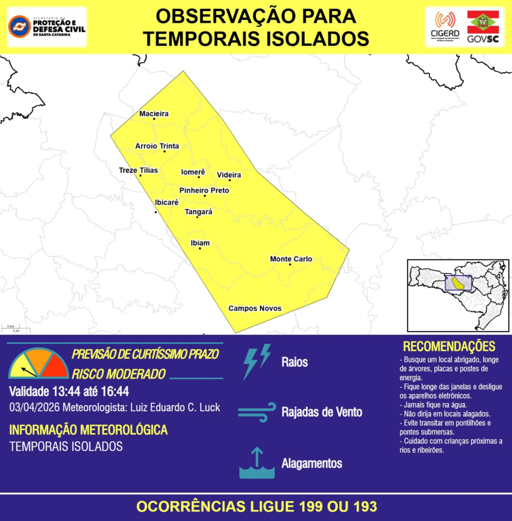 OBSERVAÇÃO – 03/04 13:44 – TEMPORAIS ISOLADOS com RAIOS, RAJADAS DE VENTO e ALAGAMENTOS pontuais para os municípios de Arroio Trinta, Campos Novos, Ibiam, Ibicaré, Iomerê, Macieira, Monte Carlo, Pinheiro Preto, Tangará, Treze Tílias e Videira nas próximas 3 horas. Ocorrências ligue 199 ou 193.