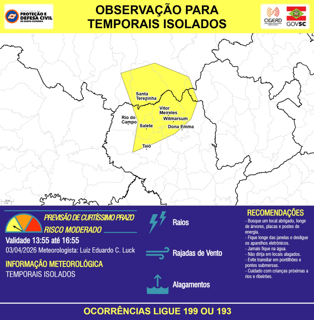 OBSERVAÇÃO – 03/04 13:55 – TEMPORAIS ISOLADOS com RAIOS, RAJADAS DE VENTO e ALAGAMENTOS pontuais para os municípios de Dona Emma, Rio do Campo, Salete, Santa Terezinha, Taió, Vitor Meireles e Witmarsum nas próximas 3 horas. Ocorrências ligue 199 ou 193.