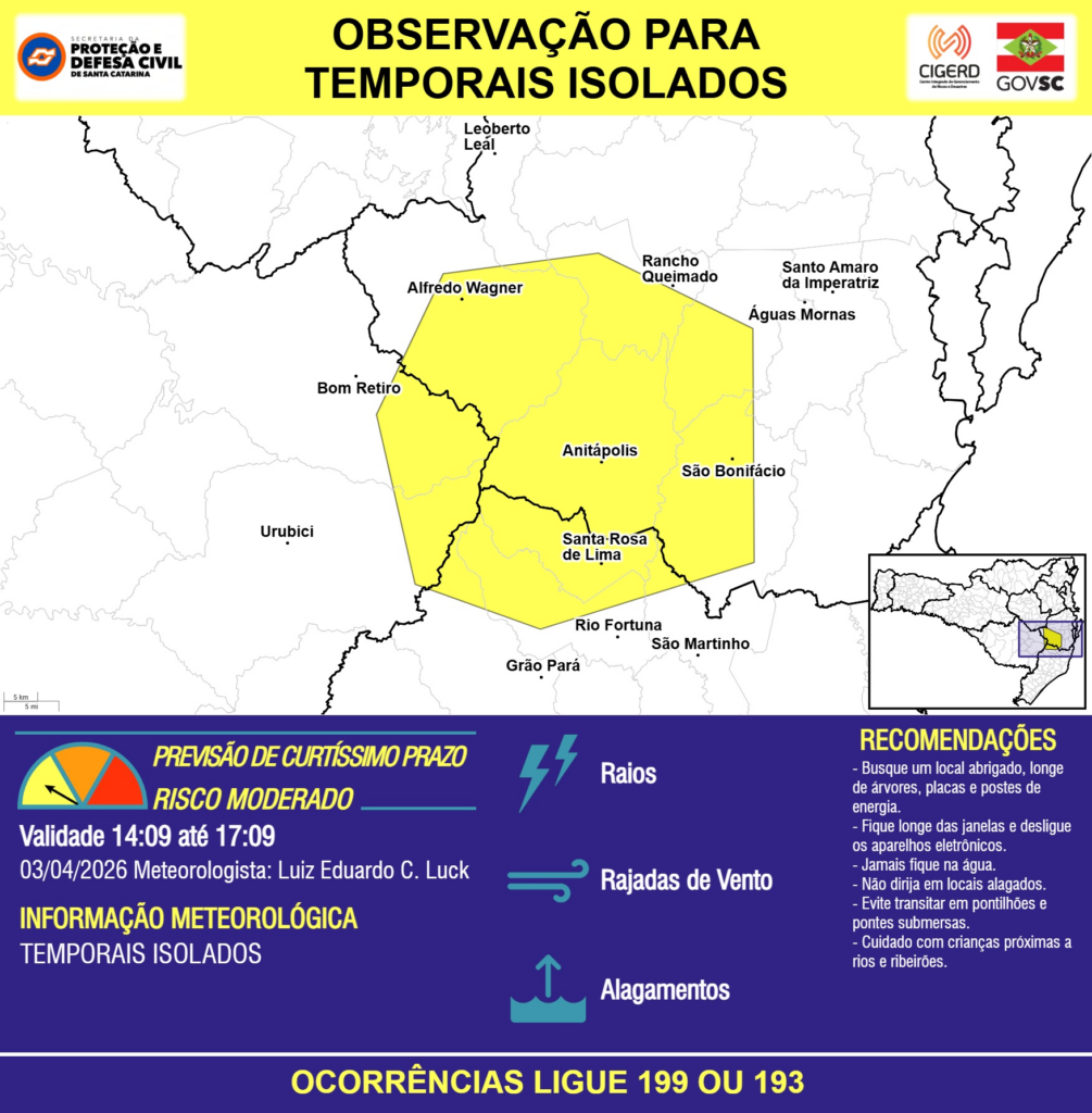 OBSERVAÇÃO – 03/04 14:09 – TEMPORAIS ISOLADOS com RAIOS, RAJADAS DE VENTO e ALAGAMENTOS pontuais para os municípios de Alfredo Wagner, Anitápolis, Bom Retiro, Grão Pará, Leoberto Leal, Rancho Queimado, Rio Fortuna, Santa Rosa de Lima, Santo Amaro da Imperatriz, São Bonifácio, São Martinho, Urubici e Águas Mornas nas próximas 3 horas. Ocorrências ligue 199 ou 193.