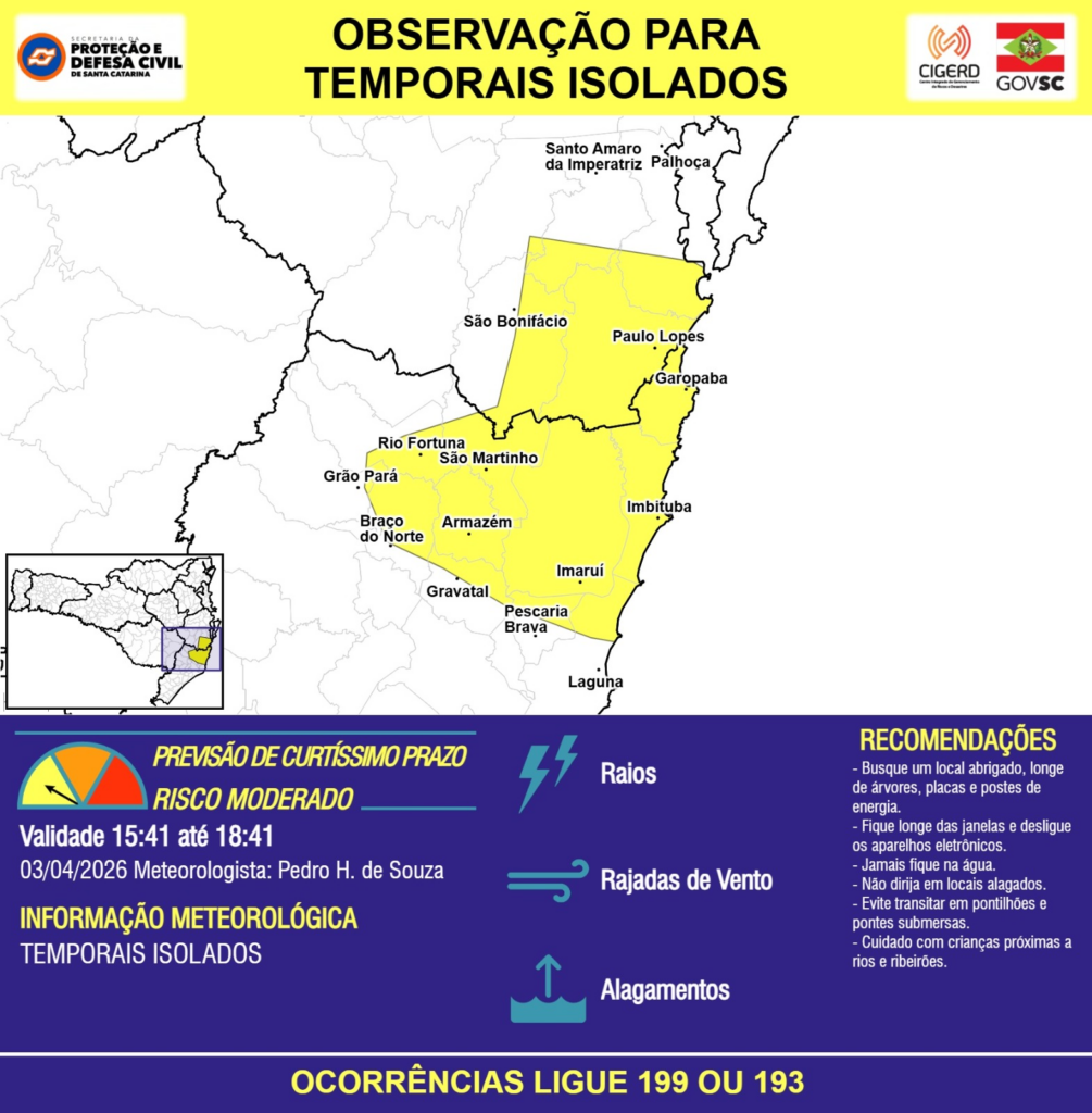 OBSERVAÇÃO – 03/04 15:41 – TEMPORAIS ISOLADOS com RAIOS, RAJADAS DE VENTO e ALAGAMENTOS pontuais para áreas dos municípios de Armazém, Braço do Norte, Garopaba, Gravatal, Grão Pará, Imaruí, Imbituba, Laguna, Palhoça, Paulo Lopes, Pescaria Brava, Rio Fortuna, Santo Amaro da Imperatriz, São Bonifácio e São Martinho nas próximas 3 horas. Ocorrências ligue 199 ou 193.