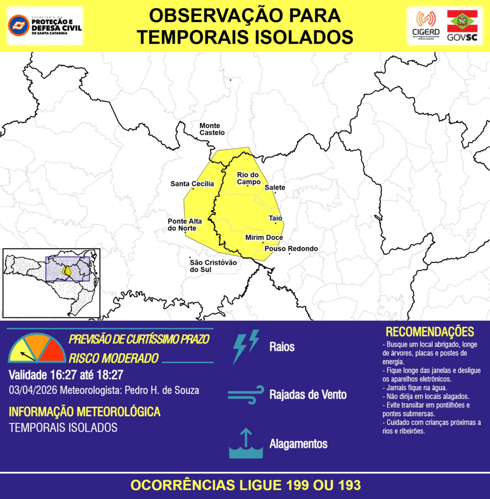 OBSERVAÇÃO – 03/04 16:27 – TEMPORAIS ISOLADOS com RAIOS, RAJADAS DE VENTO e ALAGAMENTOS pontuais para áreas dos municípios de Mirim Doce, Monte Castelo, Ponte Alta do Norte, Pouso Redondo, Rio do Campo, Salete, Santa Cecília, São Cristóvão do Sul e Taió nas próximas 2 horas. Ocorrências ligue 199 ou 193.