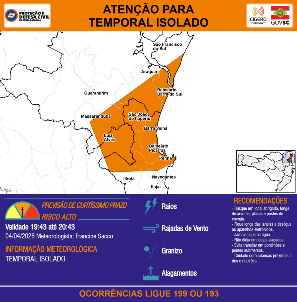 ATENÇÃO – 04/04 19:43 – TEMPORAL ISOLADO com RAIOS, RAJADAS DE VENTO, GRANIZO e ALAGAMENTOS para as regiões do Litoral Norte, Baixo e Médio Vale do Itajaí na próxima hora. Ocorrências ligue 199 ou 193.