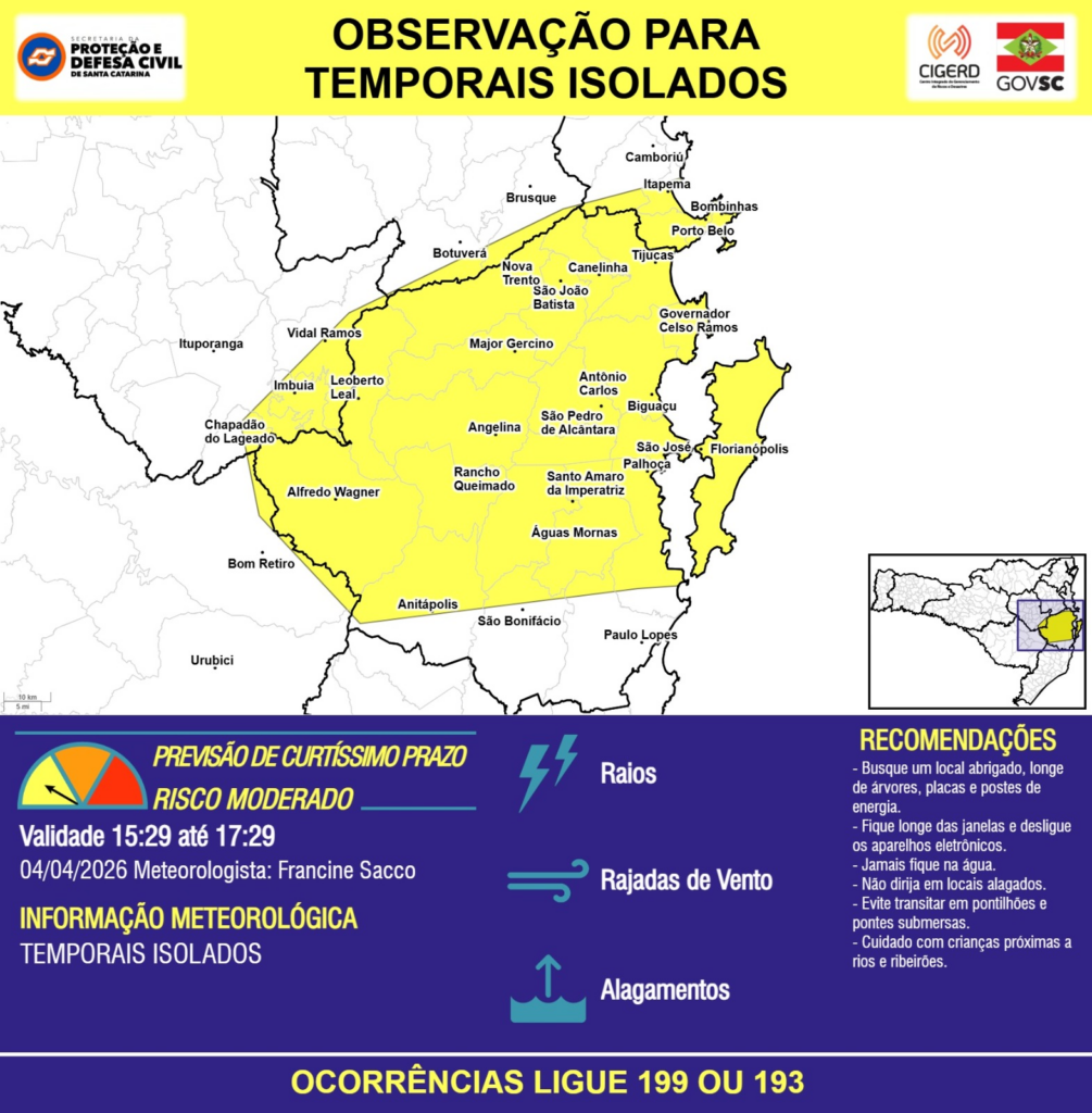 OBSERVAÇÃO – 04/04 15:29 – TEMPORAIS ISOLADOS com RAIOS, RAJADAS DE VENTO e ALAGAMENTOS pontuais para as regiões do Planalto Sul, Grande Florianópolis, Baixo, Médio e Alto Vale do Itajaí nas próximas 2 horas. Ocorrências ligue 199 ou 193.