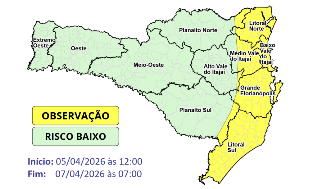 O aprofundamento gradual de uma área de baixa pressão sobre o interior do continente a intensificação do transporte de umidade do mar em direção à costa catarinense favorecem a ocorrência de chuva persistente no Litoral e temporais isolados nas demais regiões do estado entre a tarde deste domingo (05) e a madrugada da próxima terça-feira (07), oferecendo risco baixo a moderado para ocorrências relacionadas à alagamentos e enxurradas pontuais, além de destelhamentos, danos na rede elétrica e queda de galhos e árvores de forma mais pontual.
