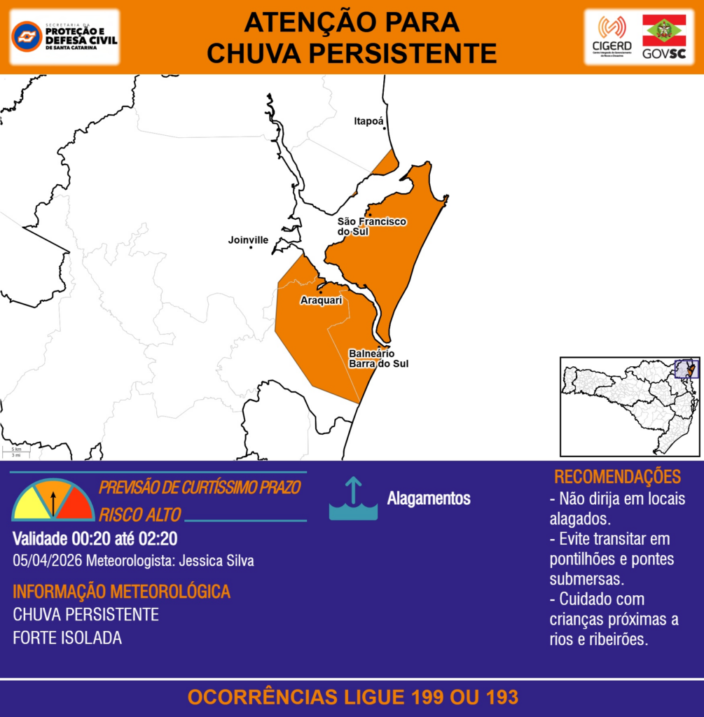 ATENÇÃO – 05/04 00:20 – CHUVA PERSISTENTE de intensidade forte isolada com ALAGAMENTOS para os municípios de Araquari, Balneário Barra do Sul, Itapoá, Joinville e São Francisco do Sul nas próximas 2 horas. Ocorrências ligue 199 ou 193.