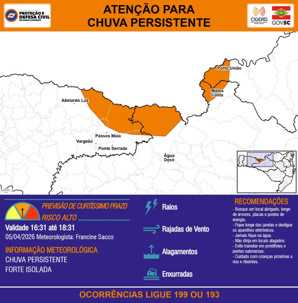 ATENÇÃO – 05/04 16:31 – CHUVA PERSISTENTE de intensidade forte isolada com RAIOS, RAJADAS DE VENTO, ALAGAMENTOS e risco de ENXURRADAS para as regiões do Oeste, Meio-Oeste e Planalto Norte nas próximas 2 horas. Ocorrências ligue 199 ou 193.