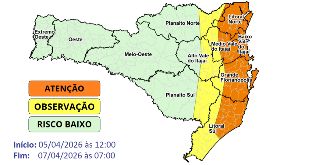 Atenção Meteorológica SDC/SC 05/04 10:00 – Chuva persistente e intensa no Litoral e temporais isolados nas demais regiões entre esse domingo (05) e a madrugada de terça-feira (07)