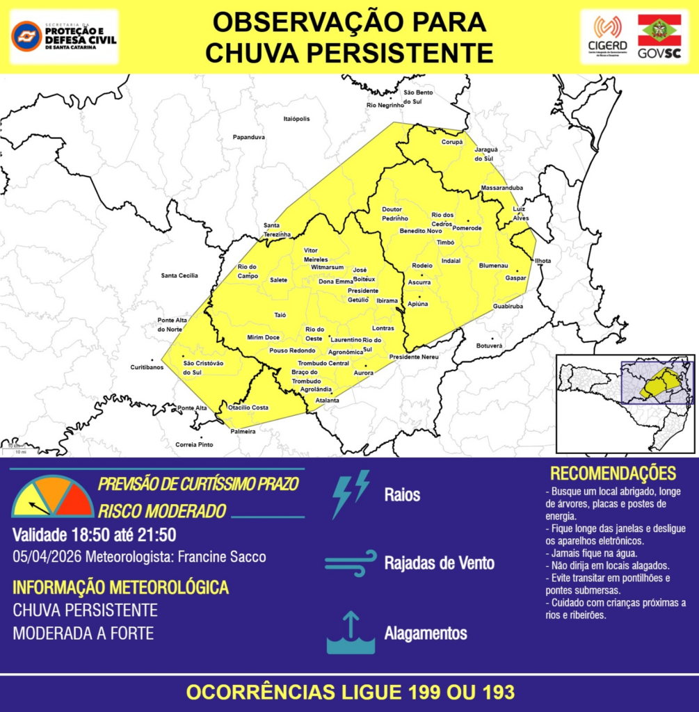 OBSERVAÇÃO – 05/04 18:50 – CHUVA PERSISTENTE de intensidade moderada a forte com RAIOS, RAJADAS DE VENTO e ALAGAMENTOS pontuais para as regiões do Meio-Oeste, Planalto Norte, Litoral Norte, Planalto Sul, Baixo, Médio e Alto Vale do Itajaí nas próximas 3 horas. Ocorrências ligue 199 ou 193.