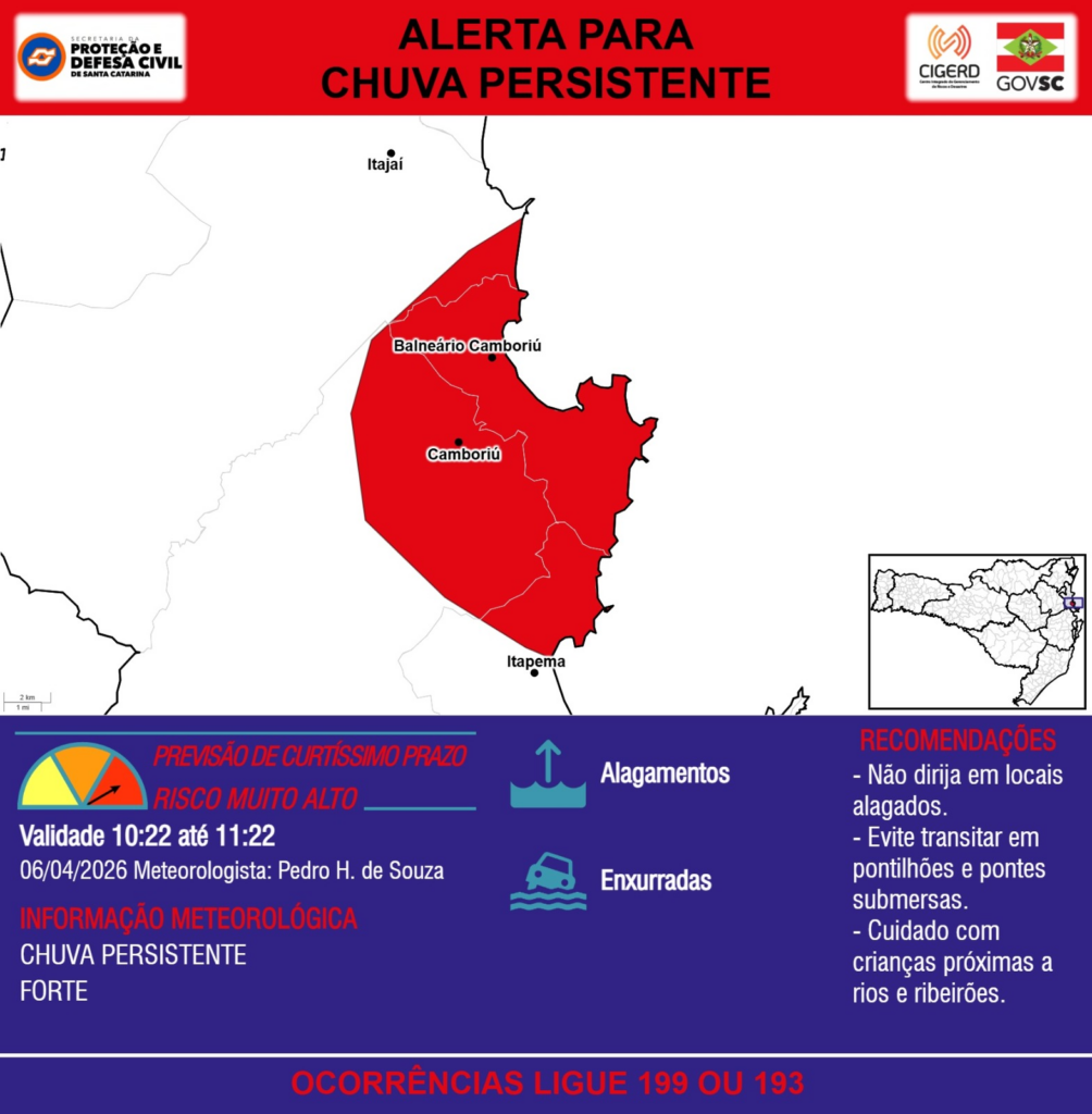 ALERTA – 06/04 10:22 – CHUVA PERSISTENTE de intensidade forte com ALAGAMENTOS e risco de ENXURRADAS para os municípios de Balneário Camboriú, Camboriú, Itajaí e Itapema na próxima hora. Ocorrências ligue 199 ou 193.