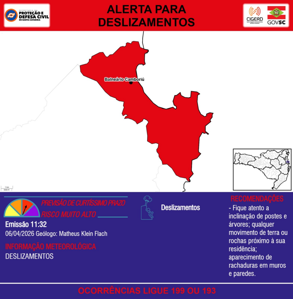 ALERTA – 06/04 11:32 – Risco de DESLIZAMENTOS para o município de Balneário Camboriú. Ocorrências ligue 199 ou 193.