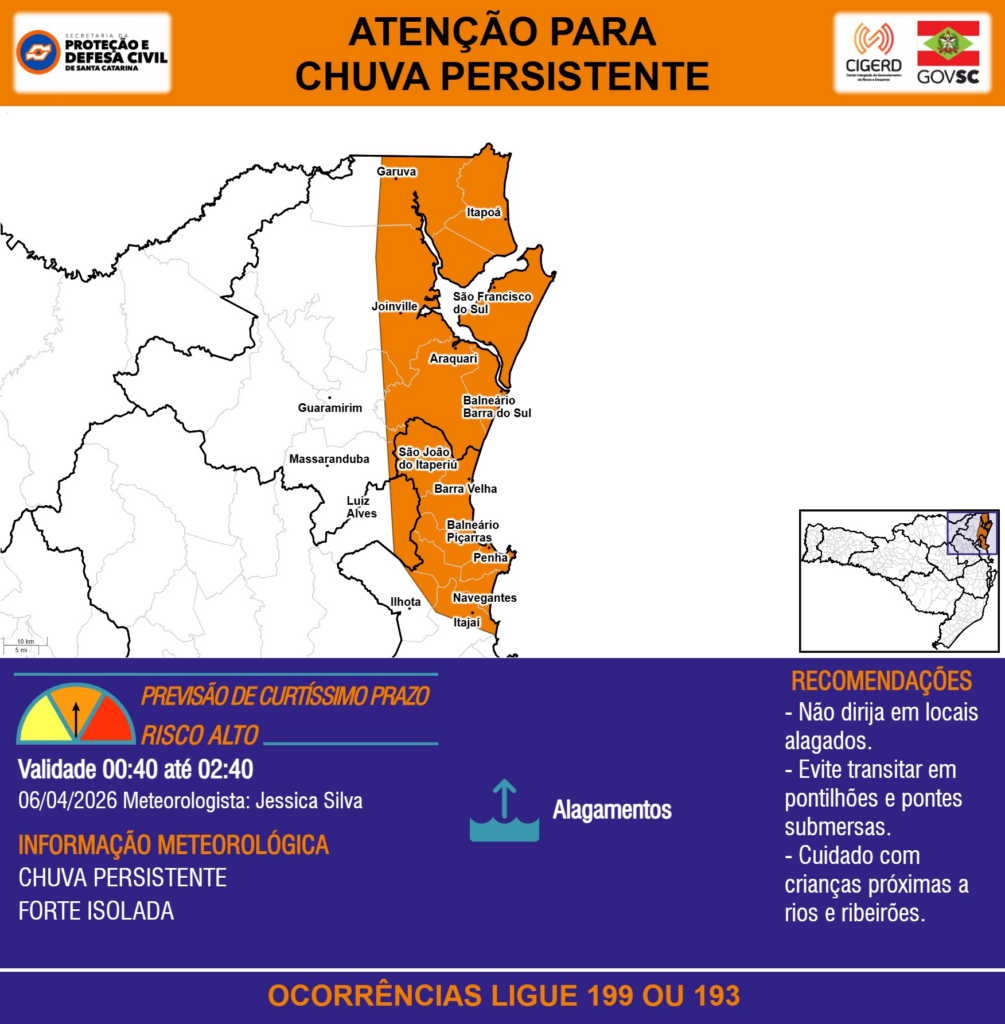 ATENÇÃO – 06/04 00:40 – CHUVA PERSISTENTE de intensidade forte isolada com ALAGAMENTOS para os municípios de Araquari, Balneário Barra do Sul, Balneário Piçarras, Barra Velha, Garuva, Guaramirim, Ilhota, Itajaí, Itapoá, Joinville, Luiz Alves, Massaranduba, Navegantes, Penha, São Francisco do Sul e São João do Itaperiú nas próximas 2 horas. Ocorrências ligue 199 ou 193.