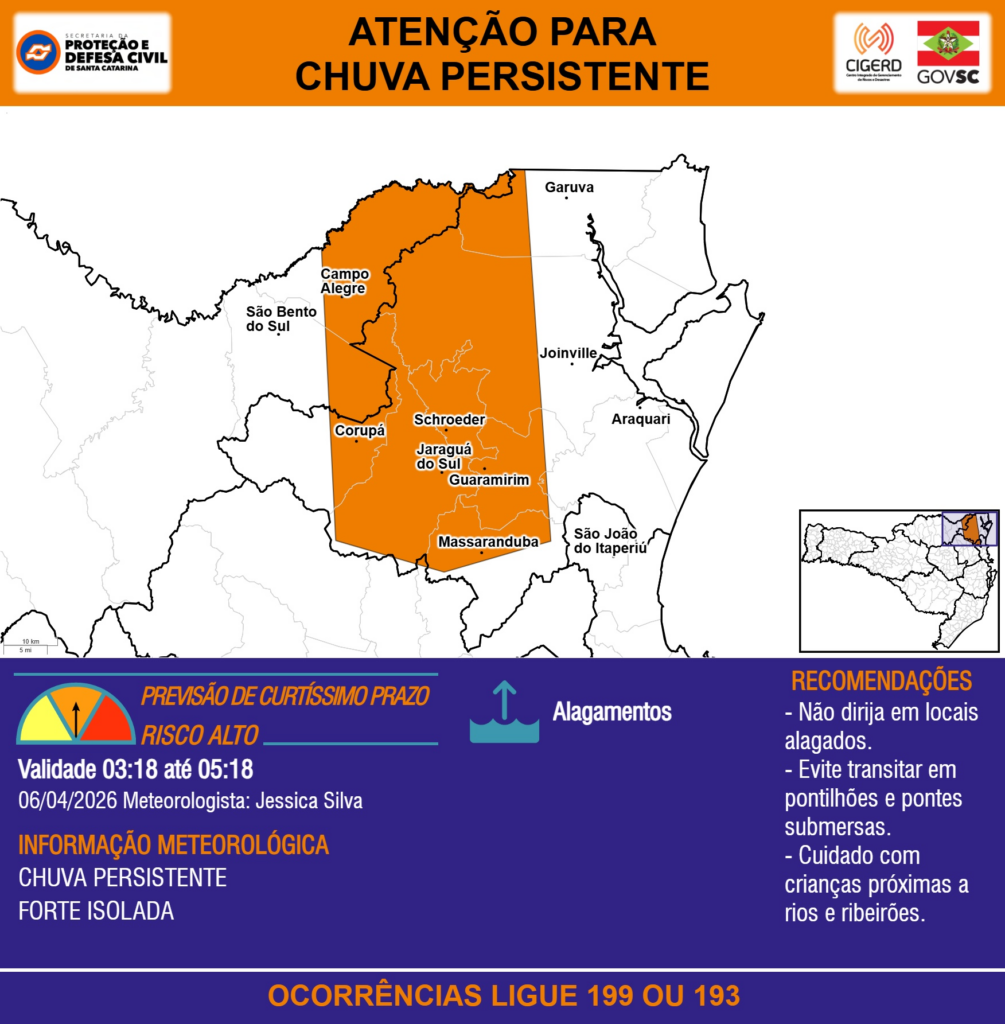 ATENÇÃO – 06/04 03:18 – CHUVA PERSISTENTE de intensidade forte isolada com ALAGAMENTOS para os municípios de Araquari, Campo Alegre, Corupá, Garuva, Guaramirim, Jaraguá do Sul, Joinville, Massaranduba, Schroeder, São Bento do Sul e São João do Itaperiú nas próximas 2 horas. Ocorrências ligue 199 ou 193.