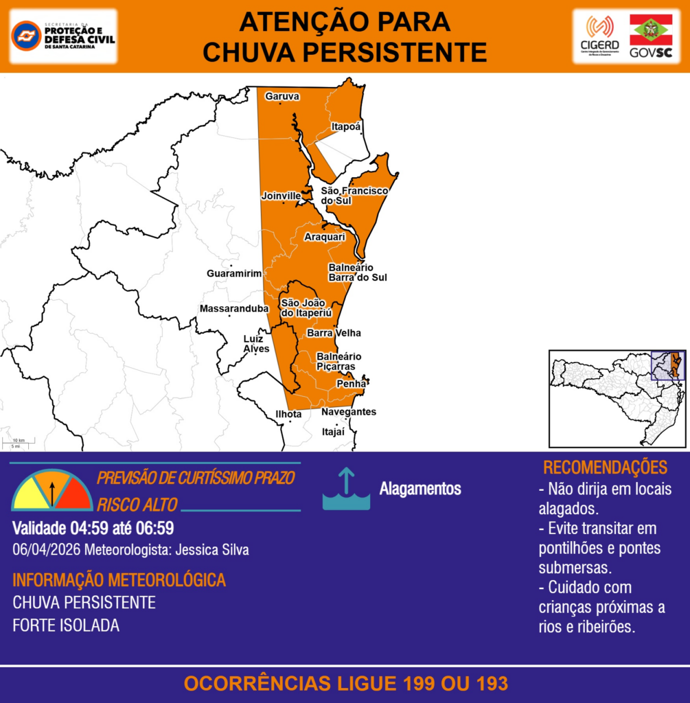 ATENÇÃO – 06/04 04:59 – CHUVA PERSISTENTE de intensidade forte isolada com ALAGAMENTOS para os municípios de Araquari, Balneário Barra do Sul, Balneário Piçarras, Barra Velha, Garuva, Guaramirim, Ilhota, Itajaí, Itapoá, Joinville, Luiz Alves, Massaranduba, Navegantes, Penha, São Francisco do Sul e São João do Itaperiú nas próximas 2 horas. Ocorrências ligue 199 ou 193.