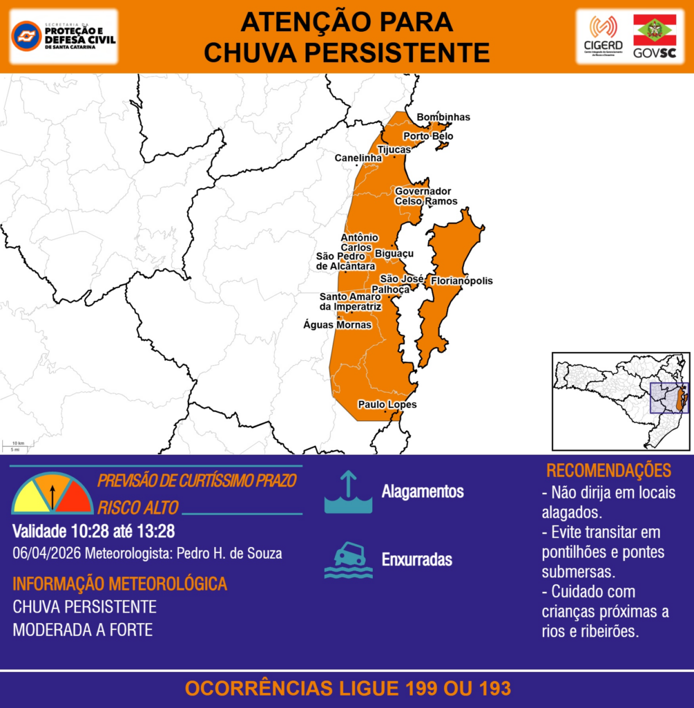 ATENÇÃO – 06/04 10:28 – CHUVA PERSISTENTE de intensidade moderada a forte com ALAGAMENTOS e risco de ENXURRADAS para os municípios de Antônio Carlos, Biguaçu, Bombinhas, Canelinha, Florianópolis, Governador Celso Ramos, Palhoça, Paulo Lopes, Porto Belo, Santo Amaro da Imperatriz, São José, São Pedro de Alcântara, Tijucas e Águas Mornas nas próximas 3 horas. Ocorrências ligue 199 ou 193.