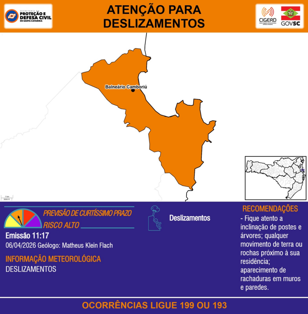 ATENÇÃO – 06/04 11:17 – Risco de DESLIZAMENTOS para o município de Balneário Camboriú. Ocorrências ligue 199 ou 193.
