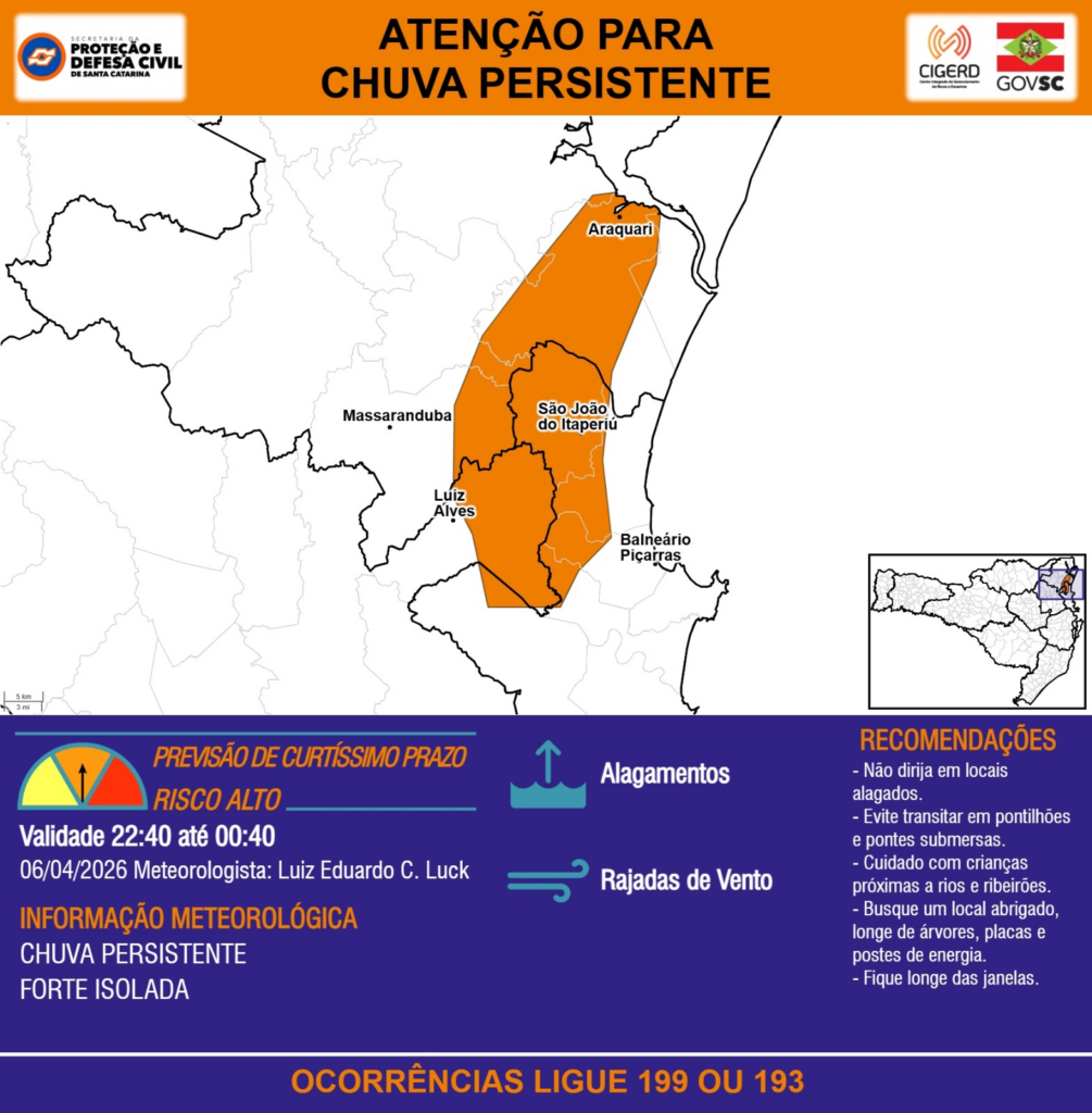 ATENÇÃO – 06/04 22:40 – CHUVA PERSISTENTE de intensidade forte isolada com ALAGAMENTOS e RAJADAS DE VENTO para os municípios de Araquari, Balneário Piçarras, Luiz Alves, Massaranduba e São João do Itaperiú nas próximas 2 horas. Ocorrências ligue 199 ou 193.