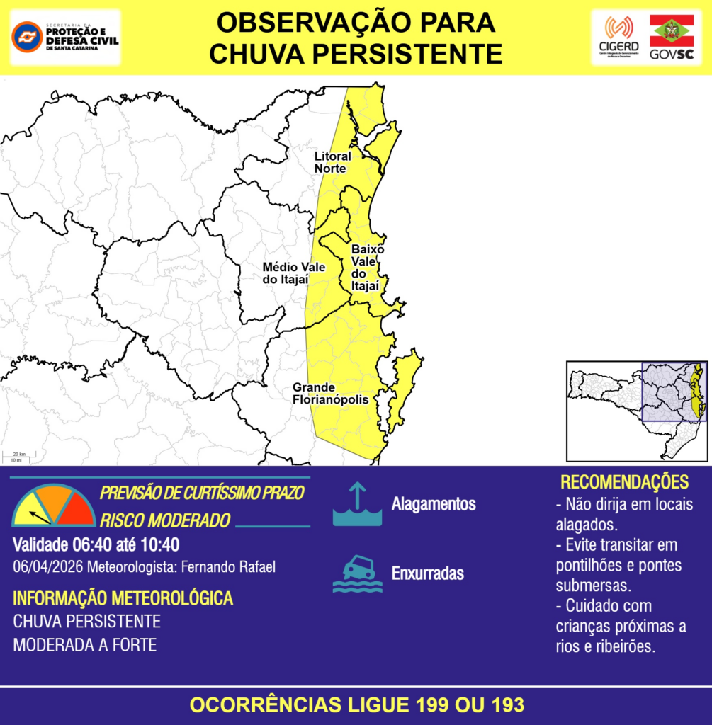 OBSERVAÇÃO – 06/04 06:40 – CHUVA PERSISTENTE de intensidade moderada a forte com ALAGAMENTOS pontuais e risco de ENXURRADAS para as regiões do Litoral Norte, Litoral Sul, Grande Florianópolis, Baixo e Médio Vale do Itajaí nas próximas 4 horas. Ocorrências ligue 199 ou 193.