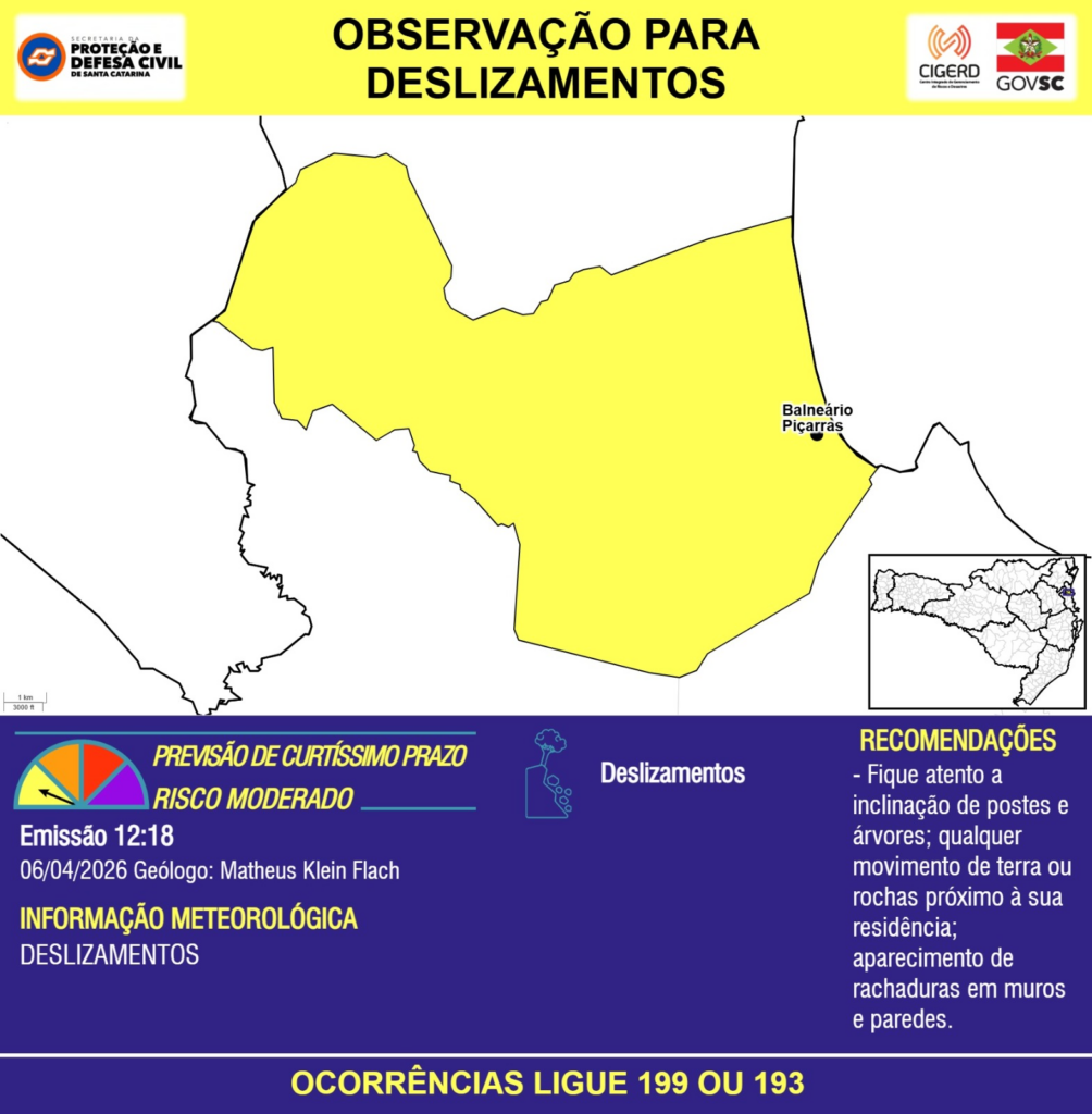 OBSERVAÇÃO – 06/04 12:18 – Risco de DESLIZAMENTOS para o município de Balneário Piçarras. Ocorrências ligue 199 ou 193.
