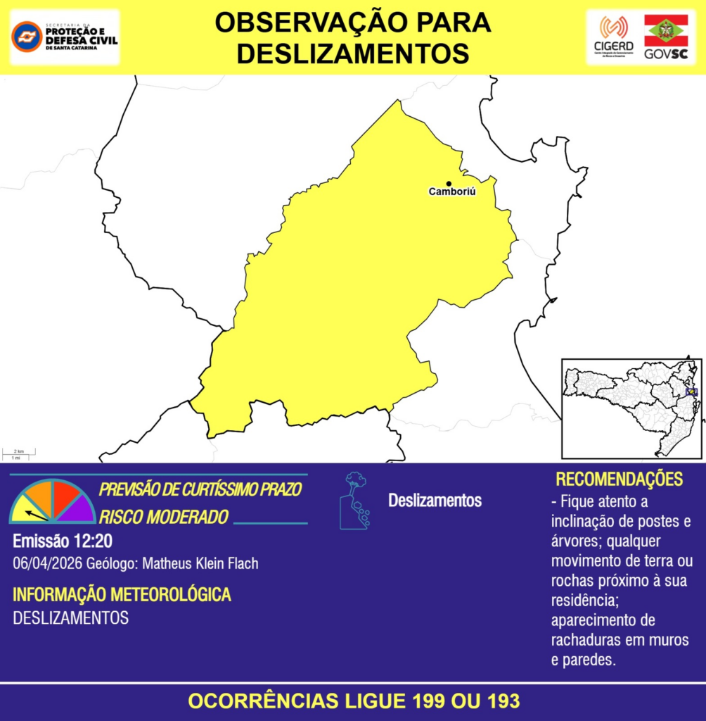 OBSERVAÇÃO – 06/04 12:20 – Risco de DESLIZAMENTOS para o município de Camboriú. Ocorrências ligue 199 ou 193.
