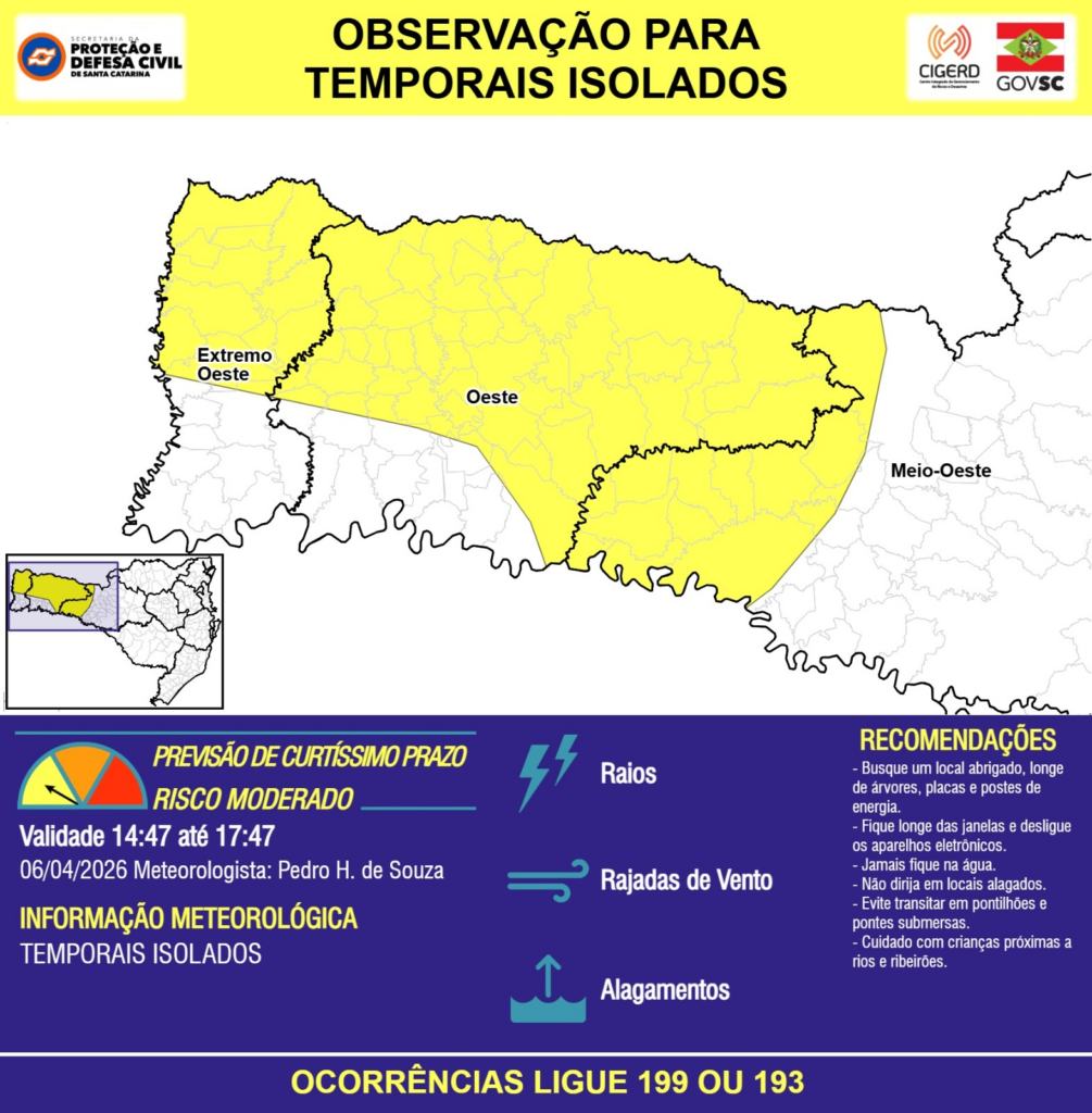 OBSERVAÇÃO – 06/04 14:47 – TEMPORAIS ISOLADOS com RAIOS, RAJADAS DE VENTO e ALAGAMENTOS pontuais para áreas das regiões do Extremo Oeste, Oeste e Meio-Oeste nas próximas 3 horas. Ocorrências ligue 199 ou 193.