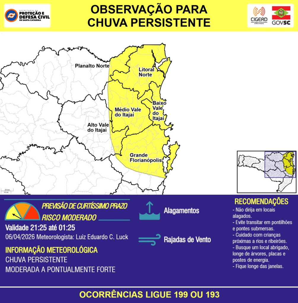 OBSERVAÇÃO – 06/04 21:25 – CHUVA PERSISTENTE de intensidade moderada a pontualmente forte com RAJADAS DE VENTO e ALAGAMENTOS pontuais para as regiões do Planalto Norte, Litoral Norte, Grande Florianópolis, Baixo, Médio e Alto Vale do Itajaí nas próximas 4 horas. Ocorrências ligue 199 ou 193.