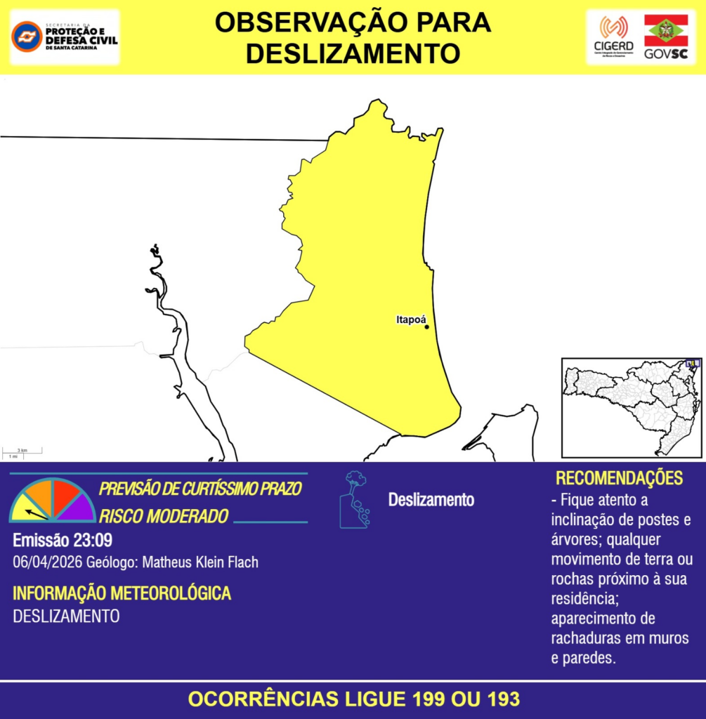 OBSERVAÇÃO – 06/04 23:09 – DESLIZAMENTO para as áreas de risco do município de Itapoá. Ocorrências ligue 199 ou 193.