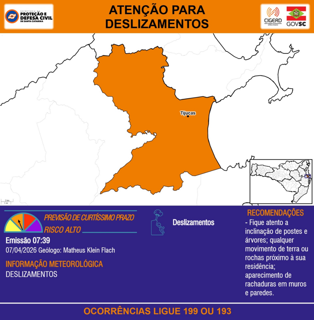 ATENÇÃO – 07/04 07:39 – DESLIZAMENTOS para o município de Tijucas. Ocorrências ligue 199 ou 193.