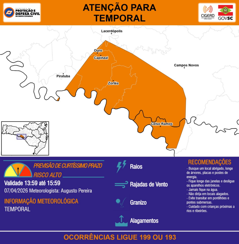 ATENÇÃO – 07/04 13:59 – TEMPORAL com RAIOS, RAJADAS DE VENTO, GRANIZO e ALAGAMENTOS para os municípios de Campos Novos, Capinzal, Celso Ramos, Lacerdópolis, Ouro, Piratuba e Zortéa nas próximas 2 horas. Ocorrências ligue 199 ou 193.