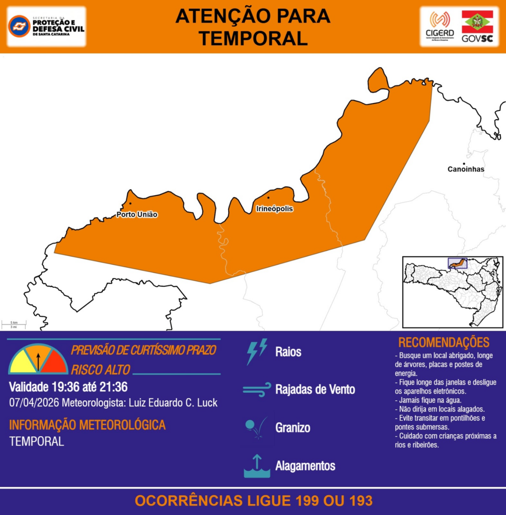 ATENÇÃO – 07/04 19:36 – TEMPORAL com RAIOS, RAJADAS DE VENTO, GRANIZO e ALAGAMENTOS para os municípios de Canoinhas, Irineópolis e Porto União nas próximas 2 horas. Ocorrências ligue 199 ou 193.