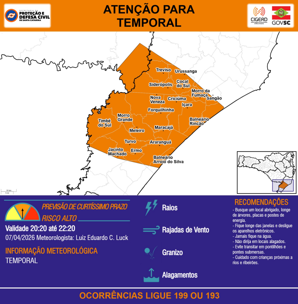 ATENÇÃO – 07/04 20:20 – TEMPORAL com RAIOS, RAJADAS DE VENTO, GRANIZO e ALAGAMENTOS para os municípios de Araranguá, Balneário Arroio do Silva, Balneário Rincão, Cocal do Sul, Criciúma, Ermo, Forquilhinha, Içara, Jacinto Machado, Maracajá, Meleiro, Morro Grande, Morro da Fumaça, Nova Veneza, Sangão, Siderópolis, Timbé do Sul, Treviso, Turvo e Urussanga nas próximas 2 horas. Ocorrências ligue 199 ou 193.