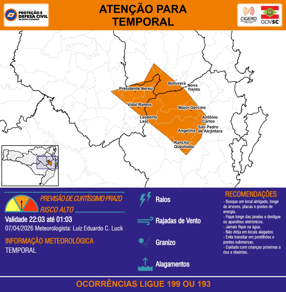 ATENÇÃO – 07/04 22:03 – TEMPORAL com RAIOS, RAJADAS DE VENTO, GRANIZO e ALAGAMENTOS para os municípios de Angelina, Antônio Carlos, Botuverá, Leoberto Leal, Major Gercino, Nova Trento, Presidente Nereu, Rancho Queimado, São Pedro de Alcântara, Vidal Ramos nas próximas 3 horas. Ocorrências ligue 199 ou 193.