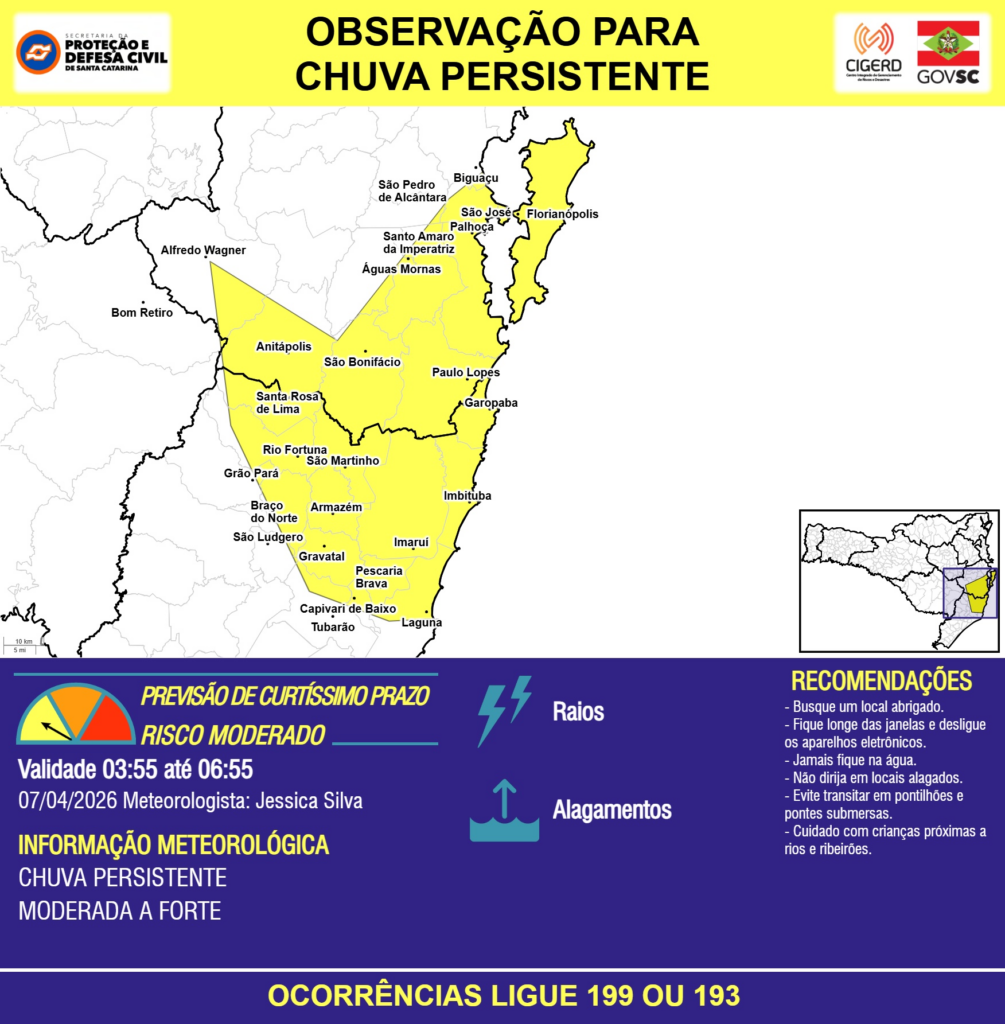 OBSERVAÇÃO – 07/04 03:55 – CHUVA PERSISTENTE de intensidade moderada a forte com RAIOS e ALAGAMENTOS pontuais para as regiões do Planalto Sul, Litoral Sul e Grande Florianópolis nas próximas 3 horas. Ocorrências ligue 199 ou 193.