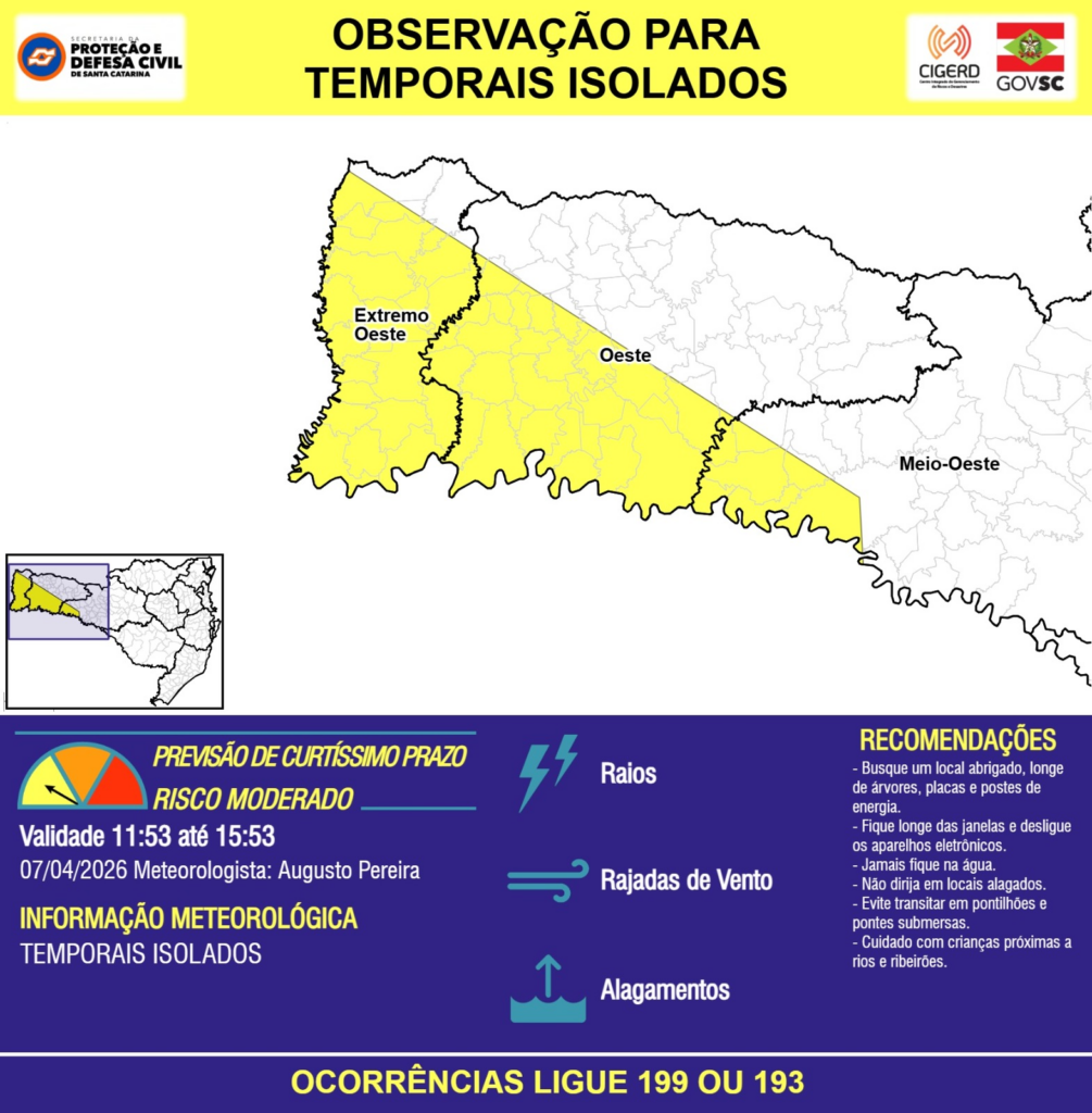 OBSERVAÇÃO – 07/04 11:53 – TEMPORAIS ISOLADOS com RAIOS, RAJADAS DE VENTO e ALAGAMENTOS pontuais para as regiões do Extremo Oeste, Oeste e Meio-Oeste nas próximas 4 horas. Ocorrências ligue 199 ou 193.