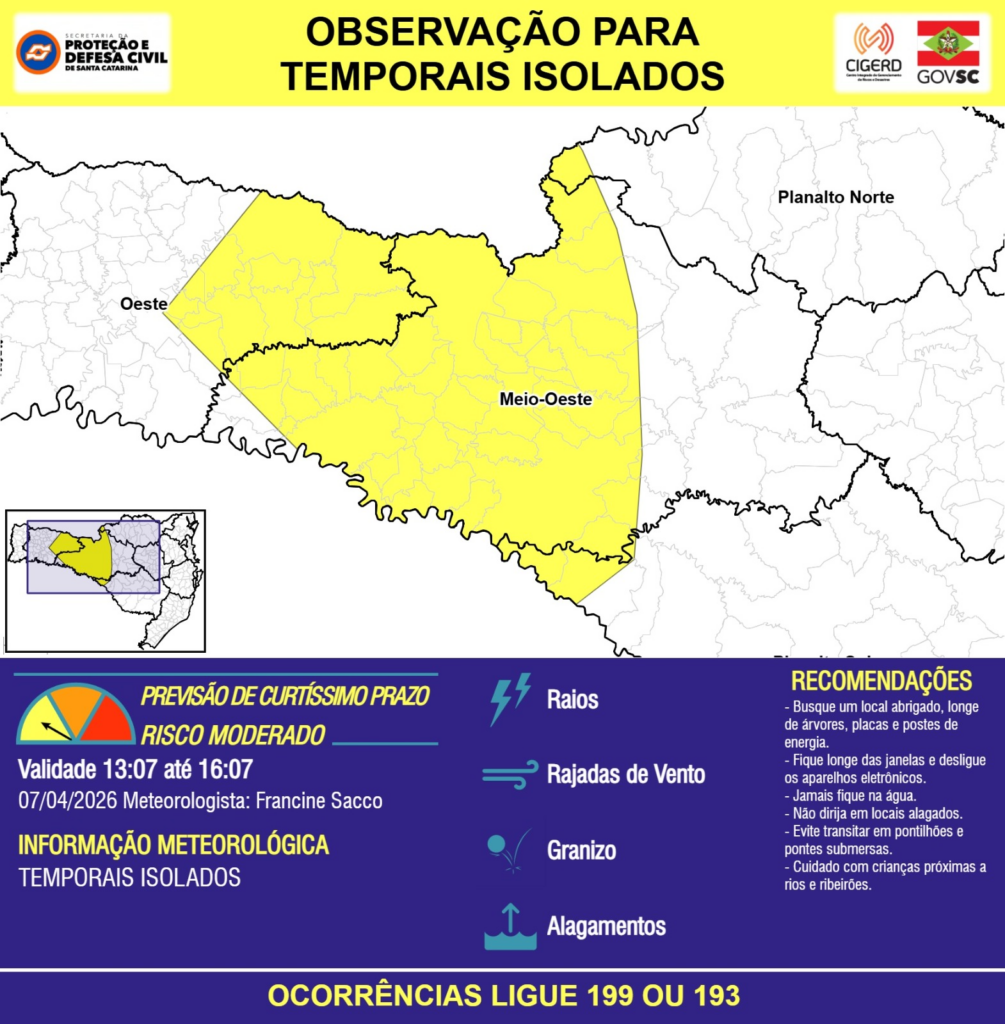 OBSERVAÇÃO – 07/04 13:07 – TEMPORAIS ISOLADOS com RAIOS, RAJADAS DE VENTO, GRANIZO e ALAGAMENTOS pontuais para as regiões do Oeste, Meio-Oeste, Planalto Norte e Planalto Sul nas próximas 3 horas. Ocorrências ligue 199 ou 193.