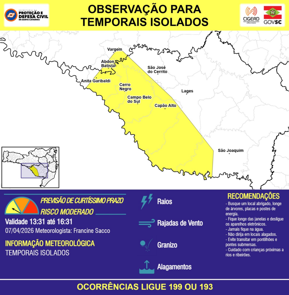 OBSERVAÇÃO – 07/04 13:31 – TEMPORAIS ISOLADOS com RAIOS, RAJADAS DE VENTO, GRANIZO e ALAGAMENTOS pontuais nas próximas 3 horas. Ocorrências ligue 199 ou 193.