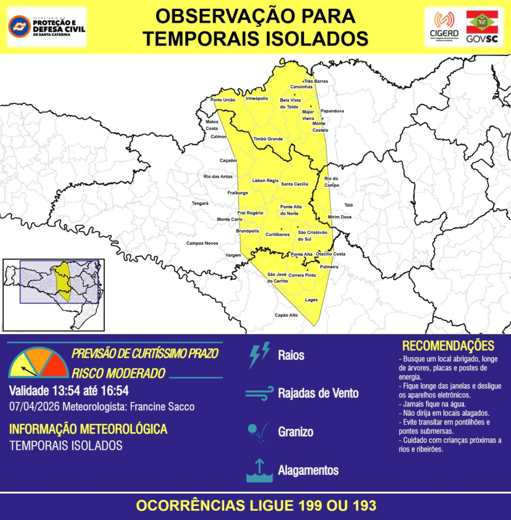 OBSERVAÇÃO – 07/04 13:54 – TEMPORAIS ISOLADOS com RAIOS, RAJADAS DE VENTO, GRANIZO e ALAGAMENTOS pontuais para as regiões do Meio-Oeste, Planalto Norte, Planalto Sul e Alto Vale do Itajaí nas próximas 3 horas. Ocorrências ligue 199 ou 193.
