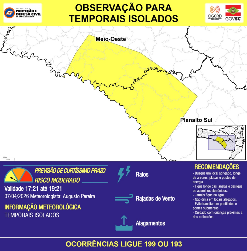 OBSERVAÇÃO – 07/04 17:21 – TEMPORAIS ISOLADOS com RAIOS, RAJADAS DE VENTO e ALAGAMENTOS pontuais para os municípios de Abdon Batista, Anita Garibaldi, Brunópolis, Campo Belo do Sul, Campos Novos, Capinzal, Capão Alto, Celso Ramos, Cerro Negro, Erval Velho, Herval d’Oeste, Ibiam, Ibicaré, Joaçaba, Lacerdópolis, Lages, Luzerna, Monte Carlo, Ouro, Piratuba, São José do Cerrito, Tangará, Vargem e Zortéa nas próximas 2 horas. Ocorrências ligue 199 ou 193.