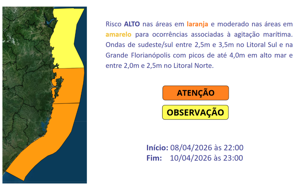 A intensificação e virada do vento na costa catarinense aumentam ainda mais a agitação do mar no Litoral catarinense, sobretudo entre o Litoral Sul e a região de Florianópolis no decorrer desta quarta-feira (08). Há inclusive risco para ressaca na quinta-feira (09), com o incremento de ondas altas geradas por um ciclone extratropical no mar, com centro entre o Litoral do RS e do Uruguai. O risco é ALTO nas áreas em laranja e MODERADO nas áreas em amarelo para ocorrências associadas à agitação marítima, durante atividades de pesca, navegação e esportes náuticos.