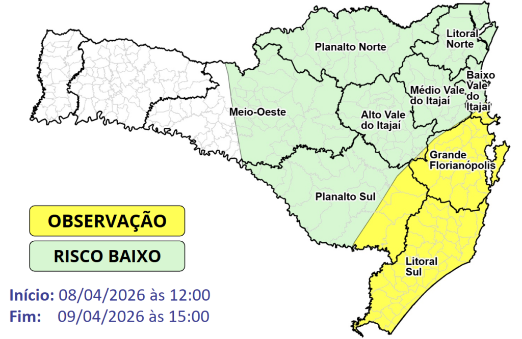 Observação Meteorológica SDC/SC 08/04 07:50 – Rajadas de vento sudoeste/sul entre a tarde desta quarta (08) e a quinta-feira (09)