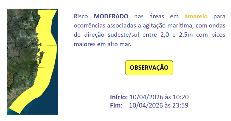 A agitação marítima diminui com relação aos dias anteriores, mas as ondas ainda apresentam altura entre 2,0 e 2,5m e direção sul/sudeste, mantendo o risco MODERADO nas áreas em amarelo para ocorrências associadas à agitação marítima, durante atividades de pesca, navegação e esportes náuticos.