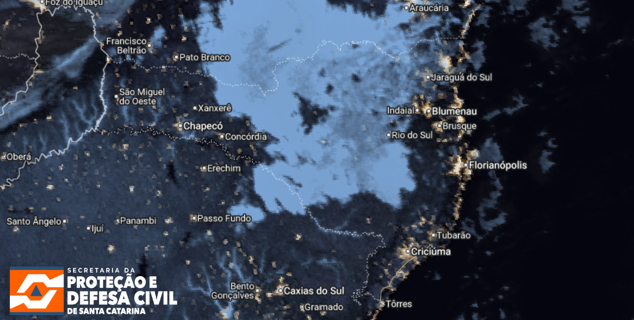 O sábado (11) começa com a atuação da circulação marítima, causando pequenos acumulados de chuva no Litoral Norte. Além disso, há presença de nuvens baixas entre o Meio-Oeste, Planaltos e Litoral Norte. Nas próximas horas, a circulação marítima continua a atuar, provocando variação de nuvens no litoral e chuva fraca, isolada e passageiras. O risco é baixo para alagamentos. No momento, os termômetros registram as menores marcas no Planalto Sul, com valores variando entre 7°C e 11°C. Nas áreas do Meio-Oeste e Planalto Norte, as temperaturas mais baixas oscilam entre 12°C e 14°C. No Grande Oeste, os menores registros ficam entre 13°C e 15°C. Já no Vale do Itajaí e em toda a faixa litorânea, as marcas mínimas variam predominantemente entre 13°C e 16°C.