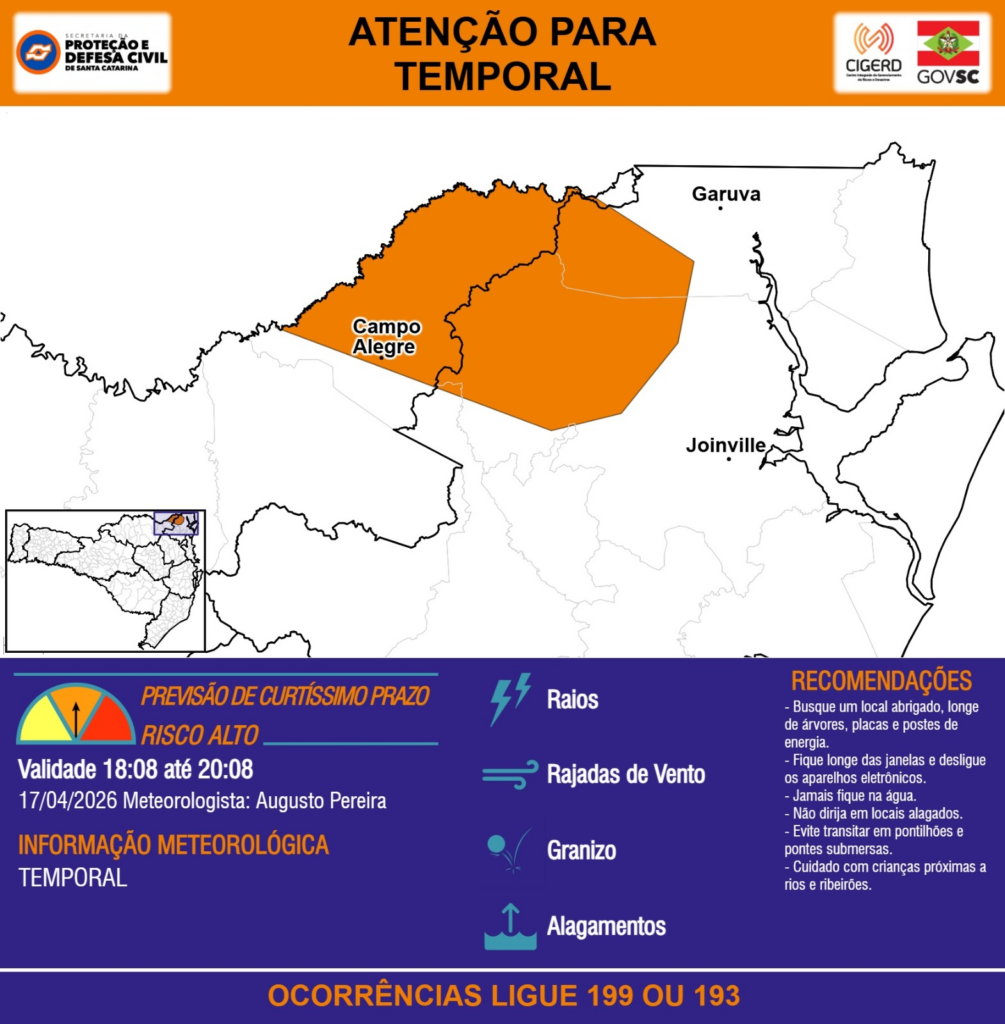 ATENÇÃO – 17/04 18:08 – TEMPORAL com RAIOS, RAJADAS DE VENTO, GRANIZO e ALAGAMENTOS para os municípios de Campo Alegre, Garuva e Joinville nas próximas 2 horas. Ocorrências ligue 199 ou 193.