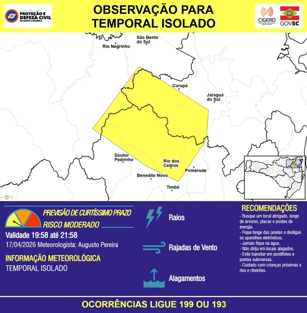 OBSERVAÇÃO – 17/04 19:58 – TEMPORAL ISOLADO com RAIOS, RAJADAS DE VENTO e ALAGAMENTOS pontuais para os municípios de Benedito Novo, Corupá, Doutor Pedrinho, Jaraguá do Sul, Pomerode, Rio Negrinho, Rio dos Cedros, São Bento do Sul e Timbó nas próximas 2 horas. Ocorrências ligue 199 ou 193.