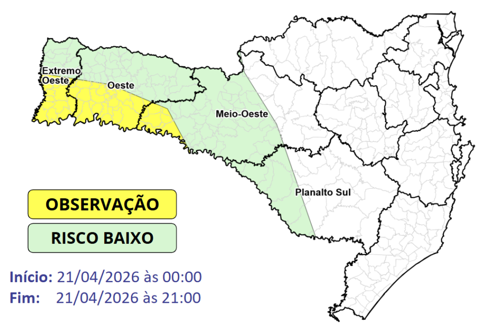 Nesta terça-feira (21), um sistema de baixa pressão que vem se desenvolvendo entre o norte da Argentina e sul do Paraguai avança em direção ao Brasil. Durante o deslocamento desse sistema, algumas regiões de Santa Catarina podem ser afetadas pelo aumento da instabilidade na atmosfera. O risco é baixo a moderado para ocorrências associadas a destelhamentos, queda de galhos e árvores, danos a rede elétrica e alagamentos pontuais.